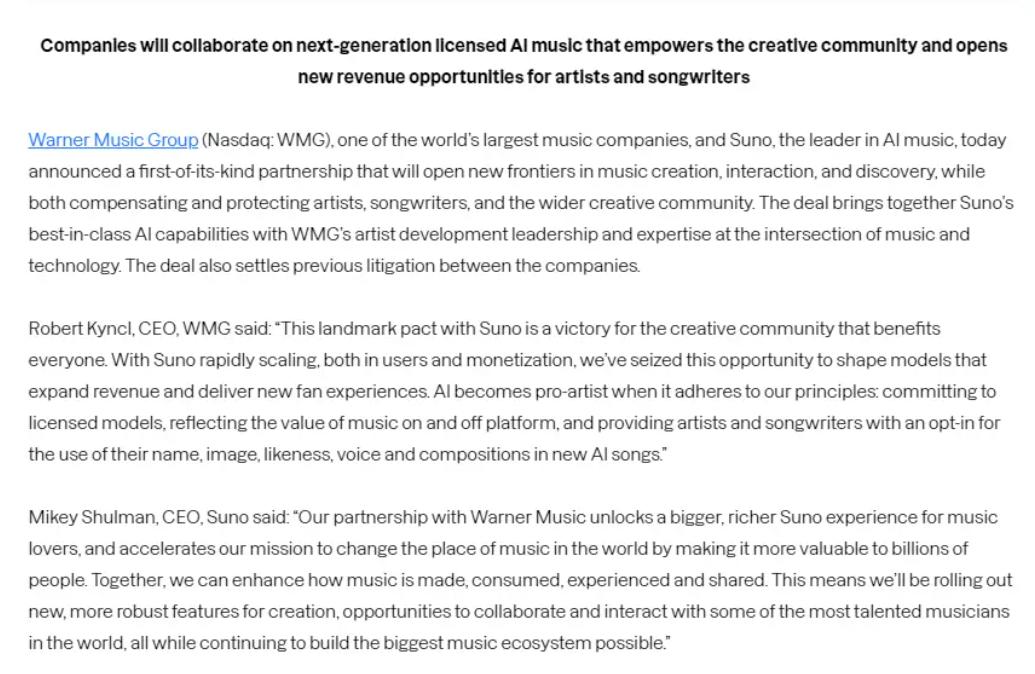 随后,和解陆续发生,2025年11月,Suno与华纳音乐完成和解并建立授权合作,Udio也先后与环球、华纳达成协议。这一系列和解所确立的方向是:AI平台须向版权方取得训练数据授权,版税分成与合规许可将成为AI音乐商业化的必要成本。